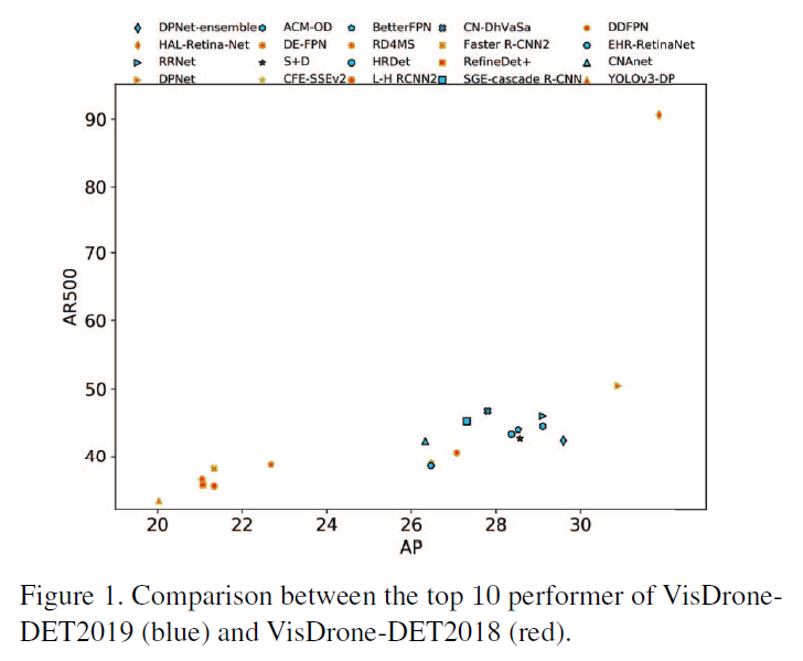 - figure 1은 VisDrone-DET2018과 VisDrone-DET2019 챌린지에서 우수한 성능을 보인 최상위 10개의 검출 기법들을 나타내고 있음.
