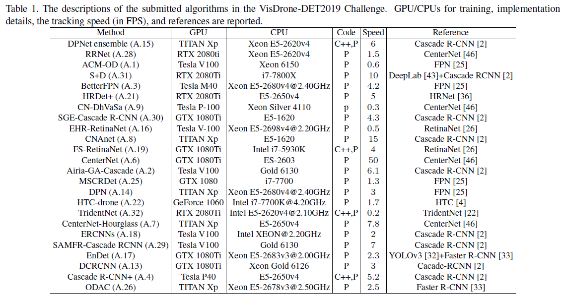 - VisDrone-DET2019 결과에 대해서 리뷰하였으며, 평가 되었던 47개의 detector들 중에서 33개가 강력한 baseline인 Cascade-RCNN[2] detector보다 우수한 성능을 보임.