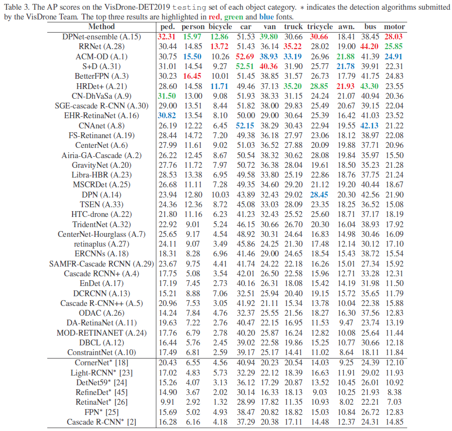 - VisDrone 팀에서 제공한 다른 7개의 baseline 기법들 중에서는 CornetNet[18]이 가장 우수한 성능을 보였으며, RetinaNet[26]이 가장 나쁜 성능을 보임.