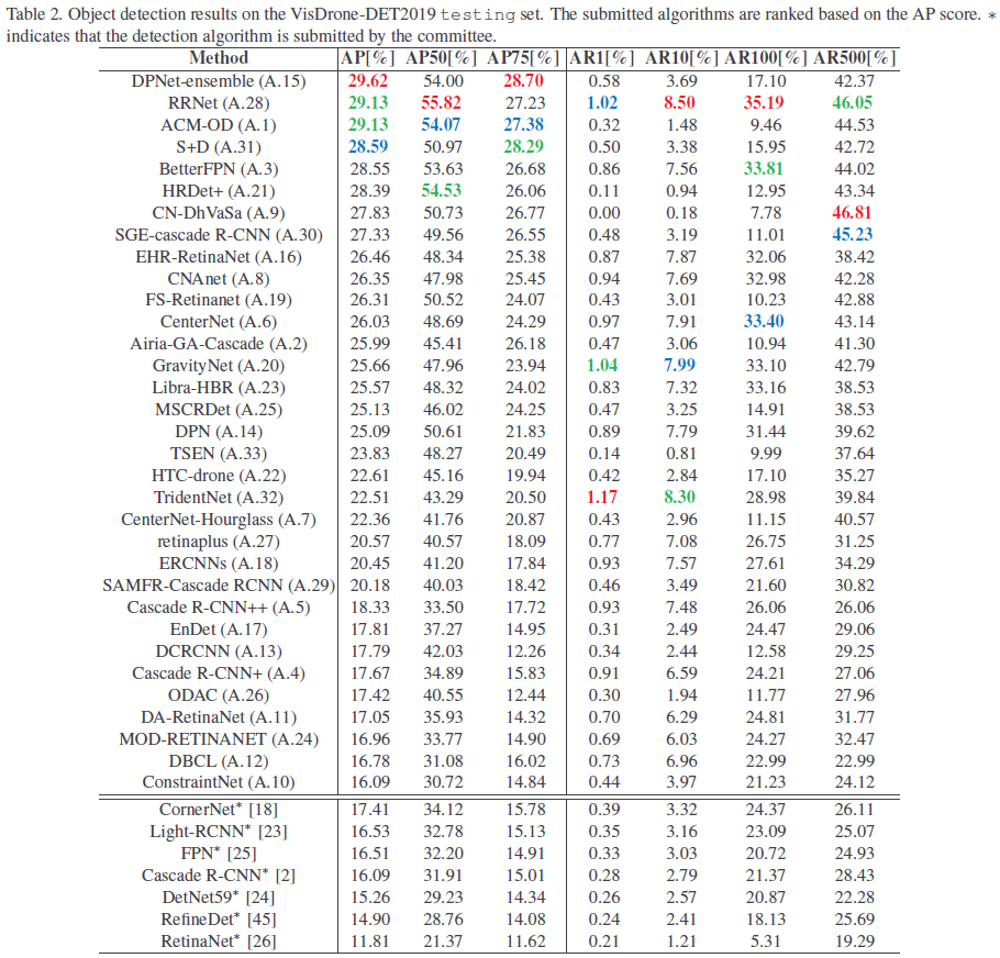 -> 최상위 3개의 detector는 DPNet-ensemble(A.15), RRNet(A.28), ACM-OD(A.1)에 해당되며, 각각 29.62%, 29.13%, 29.13%의 AP를 보임.