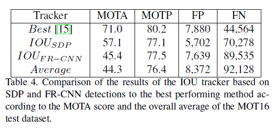 이러한 점을 고려하여, 보행자 tracking을 위한 MOT16/MOT17[11] 벤치마크에 대해 IOU tracker의 성능을 평가함.