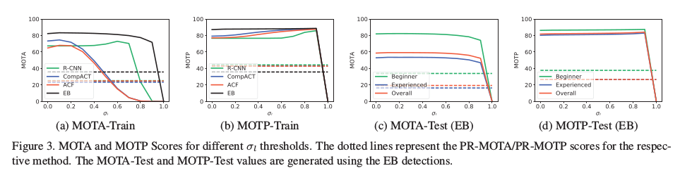 - 이 곡선에서 일반적인 CLEAR MOT metrics[14]이 계산되며, 최종적인 score는 이 곡선 아래 영역으로 구성되고 모든 detector 임계값 sigma_l에 대한 tracker의 성능을 고려함(보다 자세한 정보는 [17]을 참고할 것).