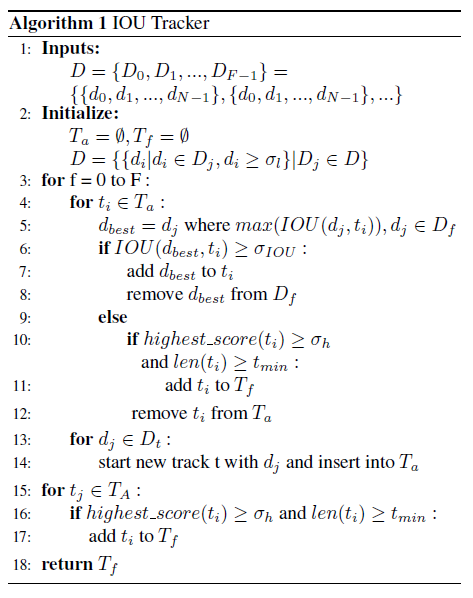 - 본 논문에서는 특정한 임계값 sigma_IOU를 만족할 경우, 이전 frame 내 마지막 detection과 가장 높은 IOU(위 식)를 갖는 detection을 연관시킴으로써, track을 본질적으로 지속할 수 있는 단순한 IOU tracker를 제안함.