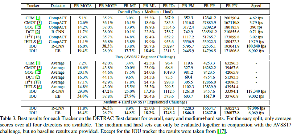 DETRAC 데이터셋 같은 경우에는 IOU tracker와 같은 단순한 tracking 기법이 지난 10년간의 연구에 기반한 접근들보다 다 우수한 결과를 보여줌.
