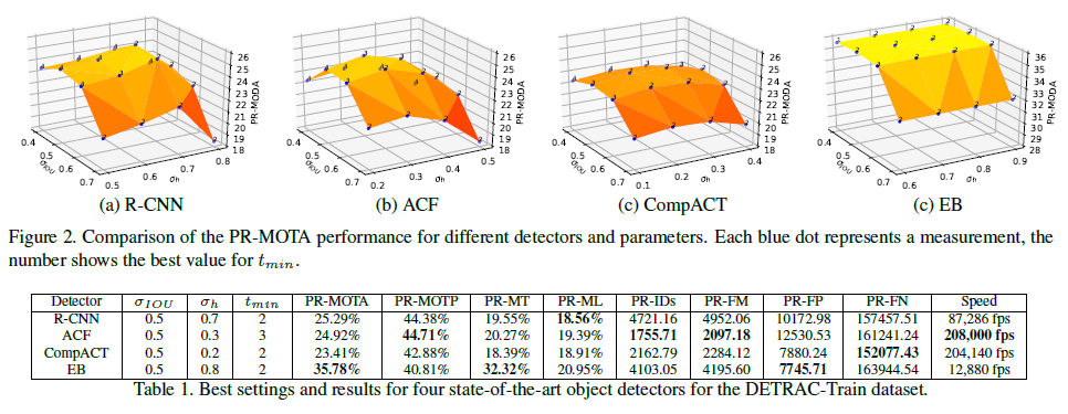 다른 참조된 detection들보다 CompACT가 훨씬 더 우수한 PR 커브의 average precision을 보였지만(자세한 내용은 [17]을 참고), ACF와 R-CNN를 이용했을 때, 더 나은 PR-MOTA 값을 얻을 수 있었음.