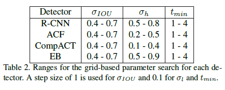sigma_IOU, sigma_h, t_min에 대한 가장 우수한 파라미터들은 각각의 detector에 대해 훈련 데이터셋 상에서 grid search를 수행하여 결정되었으며, 범위는 표 2와 같음.