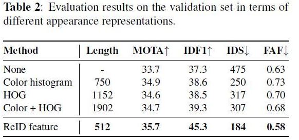 - 본 연구의 외관 표현이 다른 방법들과 비교했을 때 짧은 특징 벡터를 가짐에도 불구하고, IDF1 및 IDS의 측면에서 전통적인 hand-crafted features보다 크게 우수하다는 것을 표에서 확인 할 수 있음.