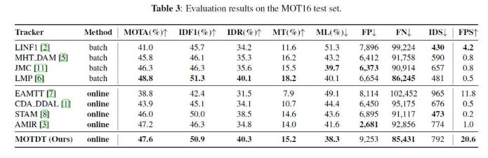 MOT16의 테스트 set에 대한 평가 결과를 보고 하였으며, 표 3과 같이 제안한 tracker를 다른 오프라인 및 온라인 tracker들과 비교함.