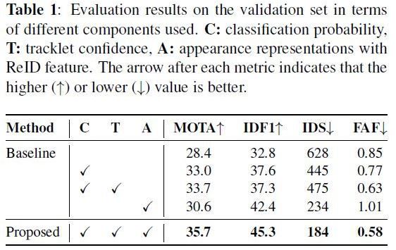 - 불확실한 tracks에 대해 벌을 줌(punish)으로써, tracklet confidence와 분류 확률의 조합은 section 3.3에서 예상한 바와 같이 MOTA를 더욱 향상시키고 false positives를 줄일 수 있었음.