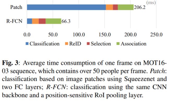detection 및 tracks의 모든 출력을 결합하는 것은 상당한 양의 후보들을 만드는 결과를 초래함. 본 연구의 classifier는 region-based fully convolutional neural network(R-FCN)[12]를 사용함으로써, 전체 이미지에 대해 대부분의 계산을 공유하게 됨. 따라서, 상당히 중첩된 후보 영역들로부터 crop하는 image patches 상의 분류보다 훨씬 더 효율적임. 이 두가지 방법에 대한 소요 시간 비교는 그림 3과 같음.