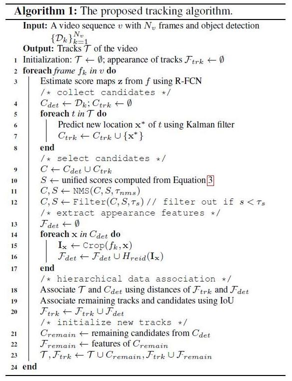 tracks의 예측은 붐비는 장면에서 발생하는 놓친 검출(missing detection)을 처리하기 위해 활용됨. 카테고리 내 가려짐에 의해 영향을 받게 되면, 이러한 예측은 다른 객체들과 연관이 될 수 있음. 다른 원하지 않는 객체와 배경을 외관 표현으로 사용하지 않기 위해, 서로 다른 features들을 사용하여 계층적으로 서로 다른 후보들을 tracks들과 연관지음.