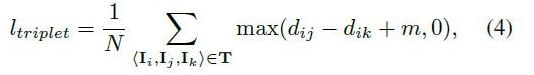 - 훈련 과정 동안에, 훈련 데이터셋에 있는 identities 이미지들은 triplets들의 집합 T={<I_i, I_j, I_k>}로 형성이 됨.