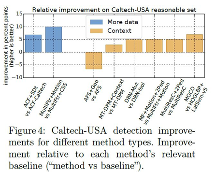 Conclusion: 비록 추가적인 테스트 데이터를 사용(section 3.4)하는 것과 비교해봤을 때 개선 정도는 낮지만, Context 정보의 활용은 보행자 검출에 있어서 일관성이 있는 성능 향상을 가져옴.