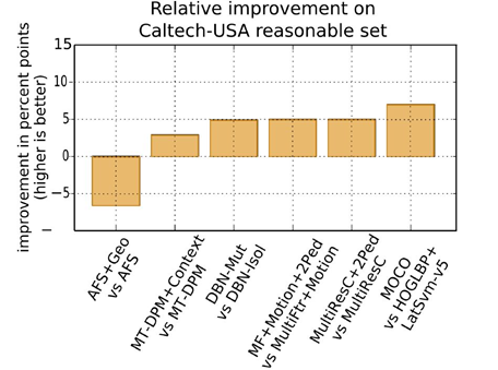 - [59, 60]에서는 더 많은(그리고 좀 더 나은) 특징들을 사용함으로써 더욱 더 성능 개선이 가능하다는 것을 보여줌. 보행자 검출을 위한 더 나은 특징들은 deep learning 접근을 통해서는 아직 얻을 수 없다는 것에 주목을 해야 함(section 3.8의 ImageNet features에 대한 언급을 참고할 것).