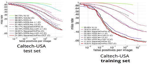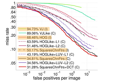 - 5) SquaresChnFtrs+DCT: [60]에서 영감을 얻어서, 각 채널을 3개의 DCT(이산 코사인 변환) 기저 함수(7x7 픽셀)와 회선시키고 필터 응답의 절대값을 추가적인 특징 채널로 저장함으로써, 10개의 HOG+LUV 채널을 40개의 채널로 확장시킴. 이러한 변종을 본 논문에서는 SquaresChnFtrs+DCT 라고 칭함.