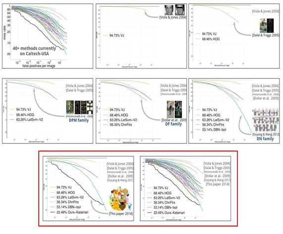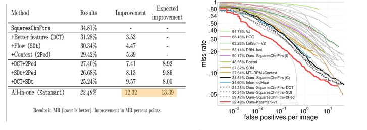 본 논문에서는 SquaresChnFtrs+DCT+SDt+2Ped의 조합을 Katamari-v1라고 칭함. 당연하게도 Katamari-v1는 Caltech-USA dataset에 대해 가장 우수한 결과에 도달함. 그림 7에서는 각각의 훈련 set과 solution family에 대해, 함께 결합한 조합이 최고의 성능을 보이는 방법임을 볼 수 있음(표 1을 참고할 것).