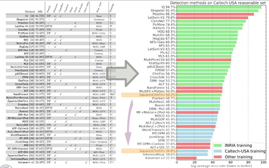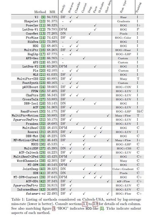 그림 3과 표 1은 Caltech pedestrian detection benchmark(July 2014)를 이용한 결과를 가지고 있는 40개 이상의 detectors들에 대한 정량적/정성적 개요를 함께 나타내고 있음.