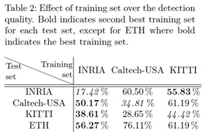 - 표 2는 다른 훈련 set(INRIA/Caltech/ETH의 경우 MR, KITTI의 경우는 AUC)을 사용했을 때 Caltech-USA에 대한SquaresChnFtrs의 성능을 보여줌. 이 실험은 Caltech 또는 KITTI 상에서 훈련된 결과는 INRIA 상에서 훈련된 결과 보다 적은 일반화 능력을 보여주는 반면에 반대는 사실이 아님. 놀랍게도, KITTI와 Caltech 사이의 시각적인 유사함에도 불구하고, KITTI와 Caltech을 위한 선택에 있어서 INRIA가 두번째로 우수한 훈련 set이라는 것임. 이는 Caltech-USA 보행자는 “their own kind(그들 자신만의 종류)”이며, INRIA dataset은 다양하기 때문에 효율성이 있다는 것임. 즉, 많지 않지만 다양한 종류를 가진 보행자(INRIA)가, 많고 유사한 종류를 가진 보행자(Caltech/KITTI) 보다 낫다는 것임.