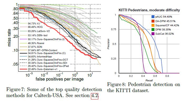 Caltech-USA와 INRIA의 결과는 log-average miss-rate(MR, 낮을수록 우수함)를 이용하여 측정되는 반면에 KITTI는 precision-recall curve(AUC, 높을수록 우수함) 내 area를 사용함.