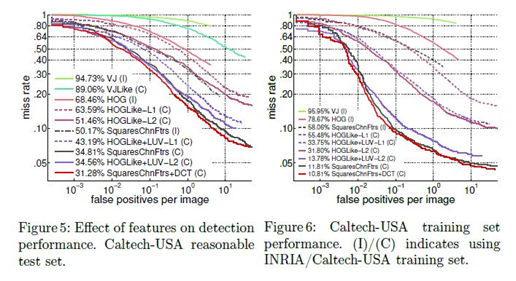 - VJ(95% MR)부터 ChnFtrs(56.34% MR, HOG와 LUV 채널 추가)를 거쳐 SquaresChnFtrs-Inria(50.17% MR, pooling size에 대해 낱낱 탐색(exhaustive search)을 함, section 4를 참고할 것)까지 개선된 특징들은 검출 성능을 개선시킴. 훈련 set을 바꾸는 것(section 3.1)은 SquaresChnFtrs-Caltech이 Caltech-USA dataset에 대해 최신의 성능에 도달 할 수 있도록 해줌. InformedHaar [43]는 을 보행자 검출에 적합하도록 수동적으로 고안된 Haar-like feature set를 이용하여 최상의 결과를 얻음. 대조적으로 SquaresChnFtrs-Caltech은 정교하게 고안한(hand-crafted) features를 사용하지 않고, 데이터에 따라 처리를 시킴으로써(data-driven) 유사한 결과를 보임.