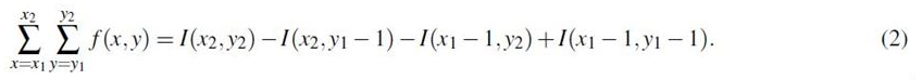 그림 2(좌측 및 가운데)는 integral image의 계산에 대해 설명하고 있음. 일단 integral image를 얻으면, 어떤 rectangle에 대한 function의 sum이라도 좌측 상단 코너(x_1, y_1)과 우측 하단 코너(x_2, y_2)을 가지고 아래의 식에 의해 일정한 시간 내에 계산이 될 수 있음.