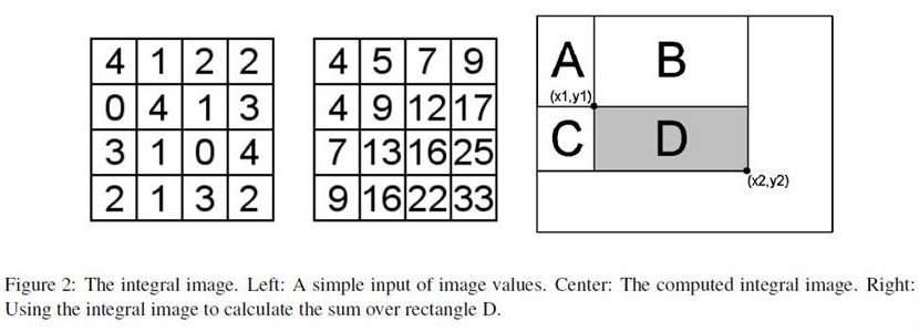 그림 2(우측)는 위의 식 (2)를 이용하여 rectangle D에 대한 f(x, y)의 sum을 계산하는 것을 나타내며, rectangle (A+B+C+D)-(A+B)-(A+C)+A 에 대한 sum을 계산하는 것과 동일함.