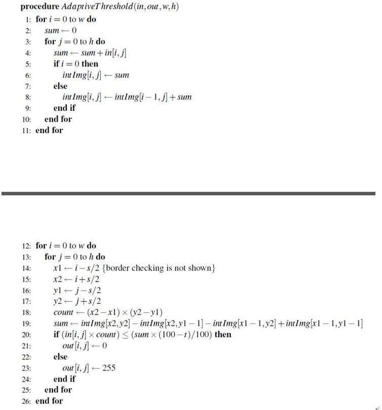 - Second pass에서는 각 pixel에 대한 integral image를 이용하여 일정 시간 내에 s x s average를 계산하고, 비교를 수행함. 만약 현재 픽셀의 값이 현재 평균 보다 t percentage 아래라면 검은색으로 설정이 되고, 그렇지 않으면 흰색으로 설정이 됨.
