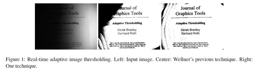 본 논문의 adaptive thresholding 기법은 Wellner의 기법[Wellner 1993]에 대한 단순한 확장 버전임. Wellner 알고리즘의 주된 아이디어는 각 픽셀들은 주변 픽셀들의 평균과 비교되도록 하는 것임.