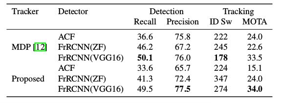 - FrRCNN과 ACF detection을 비교했을 때, 검출 품질은 추적 성능에 상당한 영향을 준다는 것을 발견함.