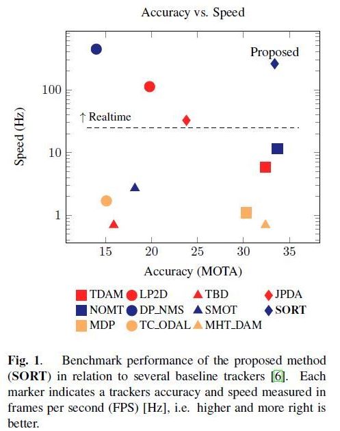 그림 1(1. INTRODUCTION 참고)은 MOT benchmark에서 속도 및 정확도와 관련된 여러 tracker들의 성향을 보여줌.