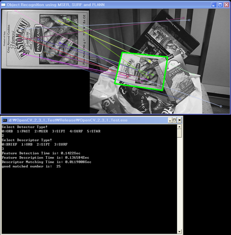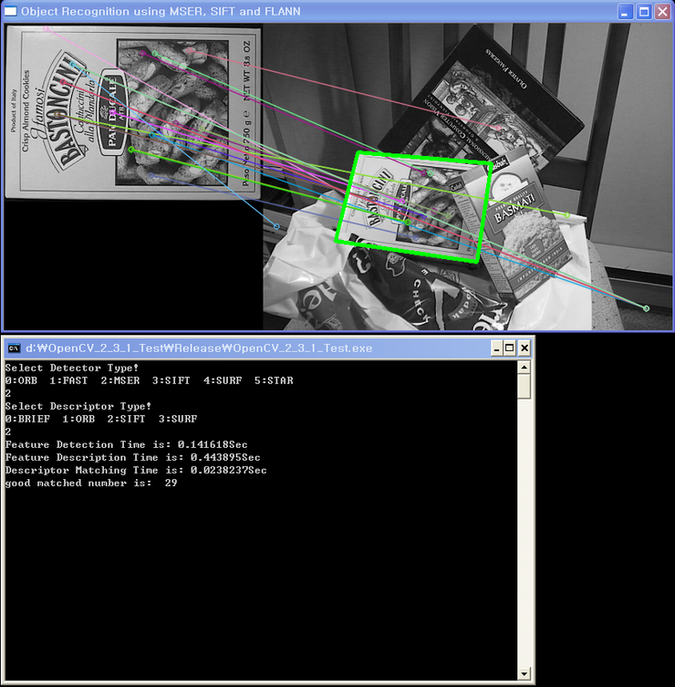 SIFT 기술자는 역시 SURF 기술자보다 느린가봅니다. 그럼 왜 느릴까요?(이에 대한 분석도 나중에 시간이 나는데로 작성을 해보도록 하겠습니다^^)