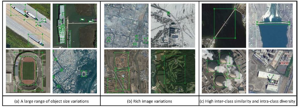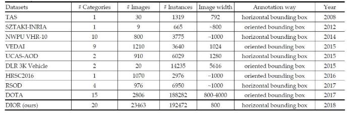 지구 관측 분야용 객체 검출 데이터셋의 제작은 많은 발전이 있었지만 여전히 아래와 같은 이유로 단점들이 있음. 이미지 개수의 부족, 객체 카테고리의 규모가 작음, 이미지의 다양성 및 객체의 변량이 불충분함.