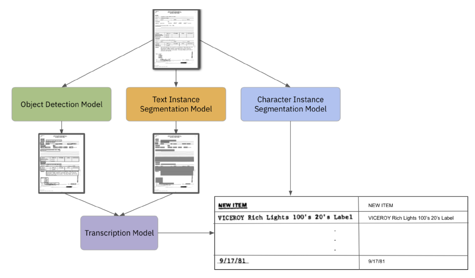 - 왼쪽 경로: object detection 모델을 통과하여 bounding boxes를 출력하고, transcription 모델을 통과하여 각각의 bounding boxes 내 text를 전사하게 됨.