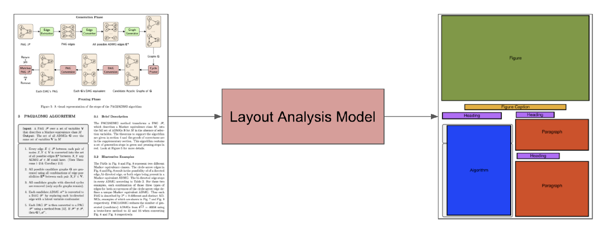그림 2: 문서는 일반적인 레이아웃 분석 모델로 전달되며, 다음의 클래스들에 해당하는 레이아웃 분할 mask 결과를 갖음: 그림(녹색), 그림 캡션(주황색), 제목(보라색), 단락(빨간색), 알고리즘(파란색). 이 문서는 허락을 받고 복사됨(Subramani, 2016).